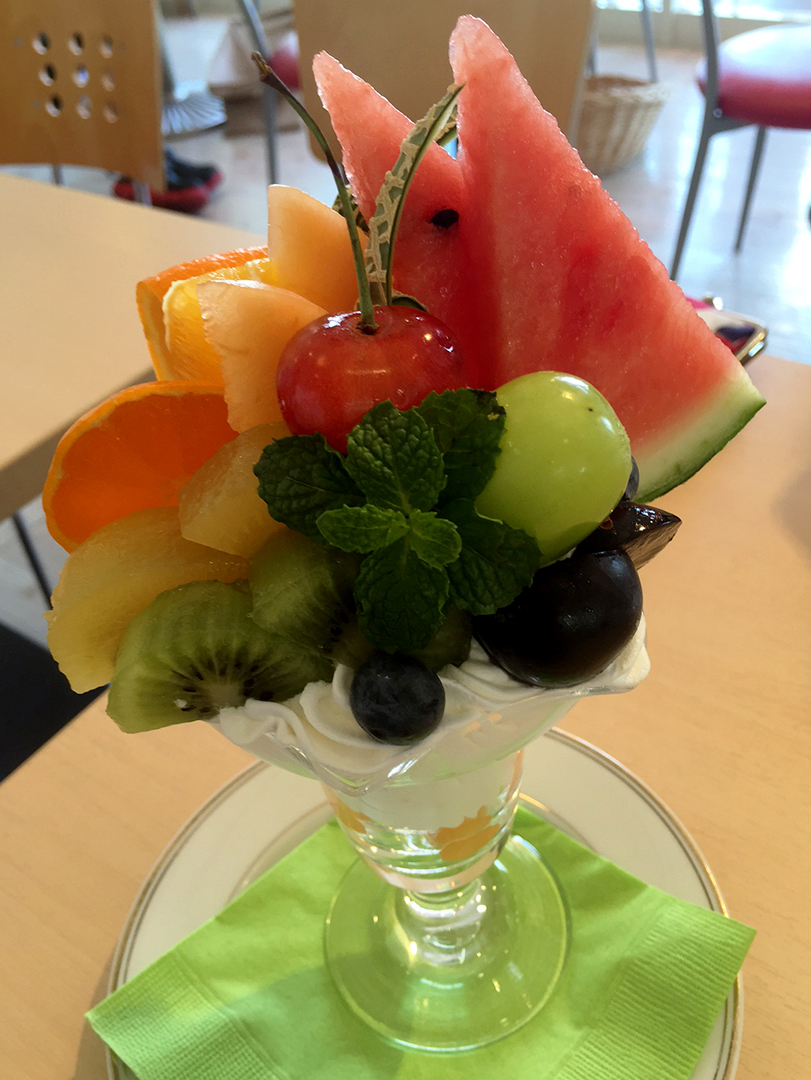 くだものを売うっているお店みせに行いきました。お店みせでは、旬しゅんのくだものを使つかったパフェやクレープが食たべられます。メニューがたくさんあって、びっくりしました。とてもおいしかったです。次つぎは、大好だいすきな桃ももがあるときに、行いきたいです。